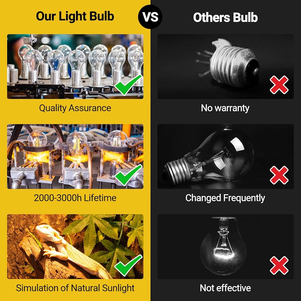 【Long Service Life】Adopt updated vacuum aluminizing process technology, the efficiency of the heat lamp bulb increase by 35% and save more energy. Good quality results from upgraded process and the reptile heat lamp can be used over 2000 hours, max 3000 hours.