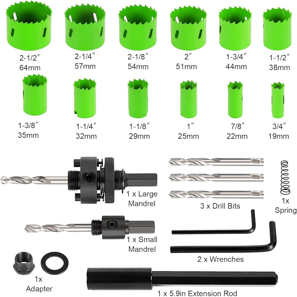 HOLE SAW KIT INCLUDES: The Hole Saw Kit contains 3pcs saw blades,3"(76mm) ,4"(102mm) ,4-1/4"(108mm),1 dust bowl,1 arbor (with1 drill bit),1 drill bit for replacement and 1 hex key are placed in a storage box
