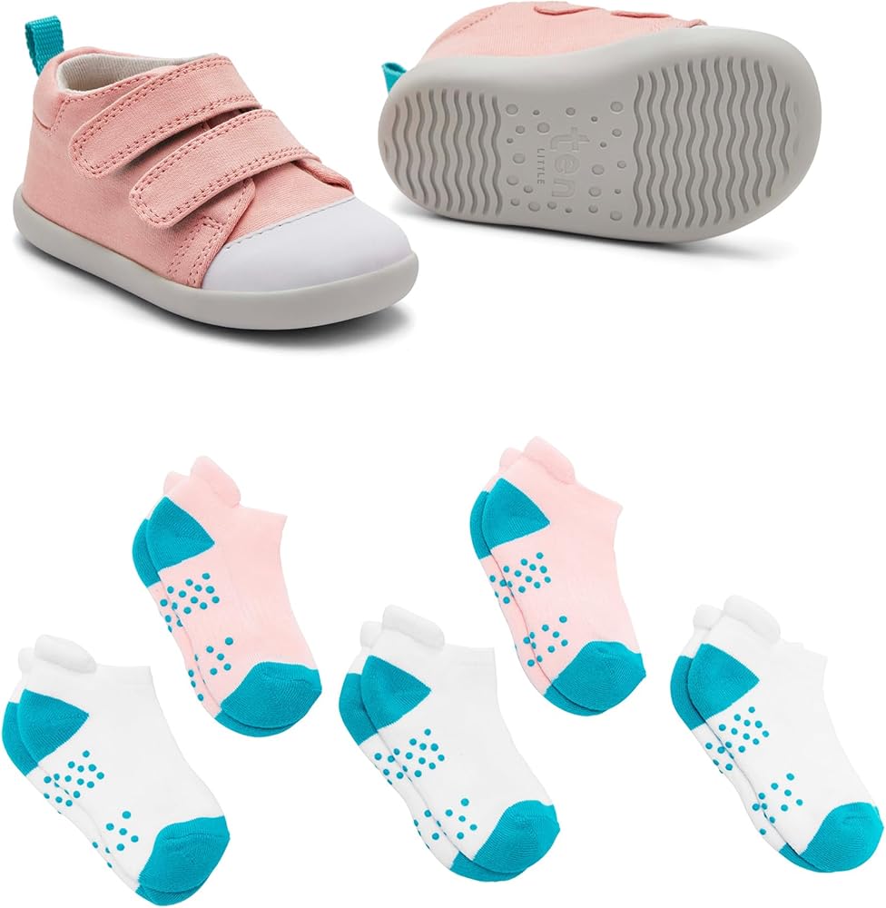 HEALTHY FOR KIDS - Approved by APMA (American Podiatric Medical Association) and developed with doctors, these shoes come with a wide, foot-shaped toe box with lots of breathing room (no squished toes!) for healthy development, and flexible, zero-drop soles for natural movement. EASY ON + SECURE FIT - Adjustable hook and loop straps & extra wide opening allow for easy on. Each pair includes removable character insoles to help kids learn left from right while also helping parents confirm size. BUILT FOR COMFORT & STABILITY - Ultra lightweight and flexible shoes made with soft & breathable cotton upper. High-traction, non-skid flexible rubber outsoles provide support, help prevent slips & develop balance. Durable toe caps protect little toes. SIMPLE IDENTIFICATION - Every sock is size-labeled (hand stitched inside the elastic) to prevent mismatched socks and make folding laundry a breeze. Our ankle socks are made longer than our crew socks as they may shrink more during washing. WOMEN FOUNDED & RUN - Ten Little is a mom-founded brand that makes the best high-quality, non-toxic products for kids at every size & stage to support healthy development & natural movement in growing kids