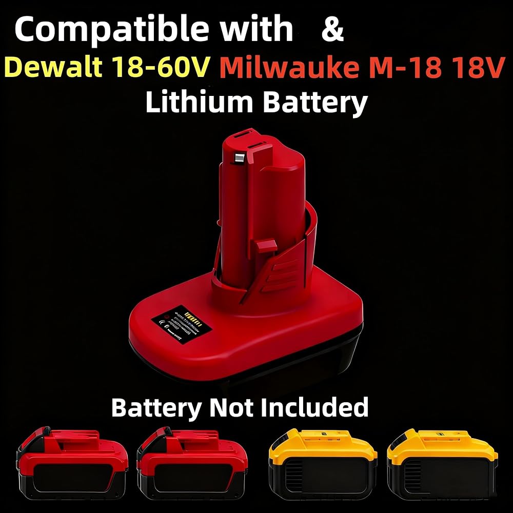 【for Dewalt & Milwaukee Li-ion Battery】The DM20M12 adapter is fully compatible with dewalt 20v li-ion battery, such as DCB200 DCB180 DCD985B DCD771C2 DCS355D1 DCB606 etc. Besides, It also work for Milwaukee M18 18V li-ion battery as well like 48-11-1811, 48-11-1815, 48-11-1820, 48-11-1822, 48-11-1828 , 48-11-1840 etc. Note: the battery not included.