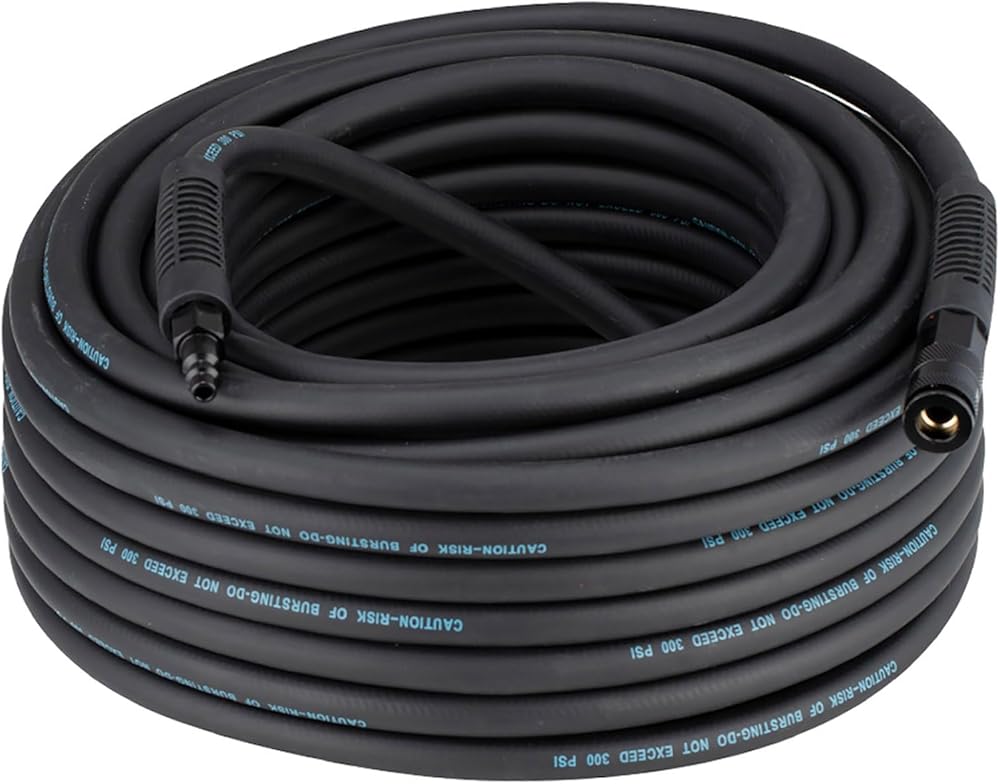 Hybrid air hose is 3/8 INCH inner diameter by 100 FEET can reach to 300 PSI for maximum working pressure, 1200 PSI bursting pressure. It can through more air flow than 1/4inch hybrid air hose. Bet part is it's easy to wrap back up and hang on the compressor when done.