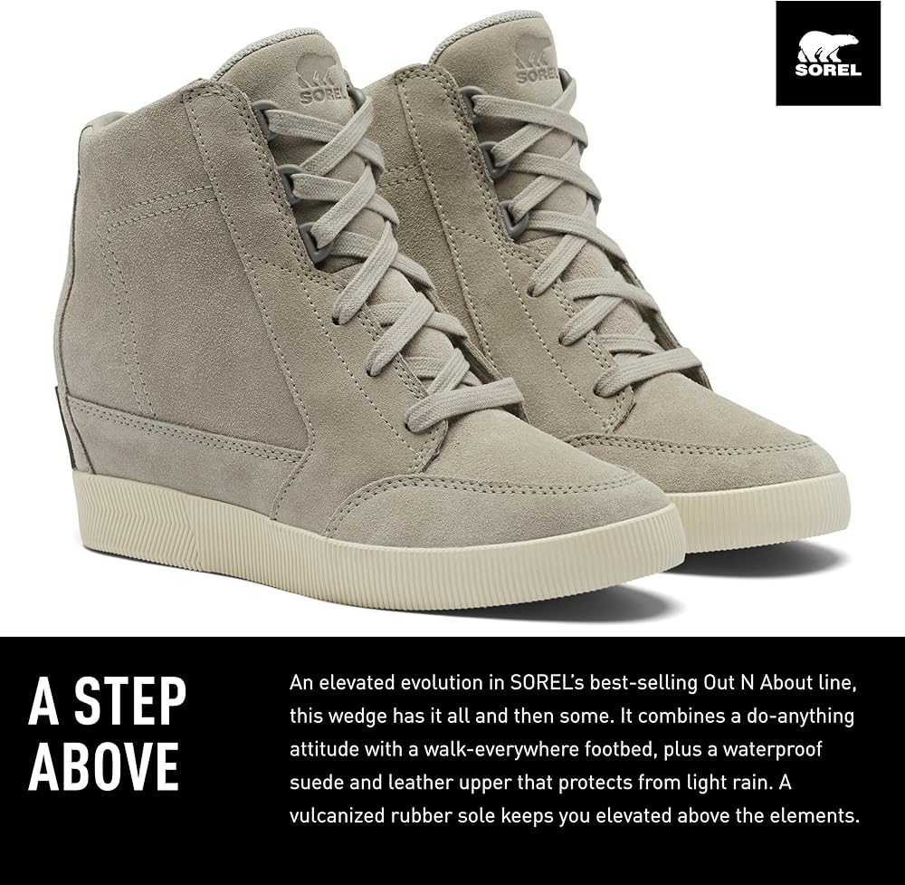 A STEP ABOVE An elevated evolution in SOREL's best-selling Out 'N About line, this wedge has it all and then some. It combines a do-anything attitude with a walk-everywhere footbed, plus a waterproof suede and leather upper that protects from light rain. A vulcanized rubber sole keeps you elevated above the elements.