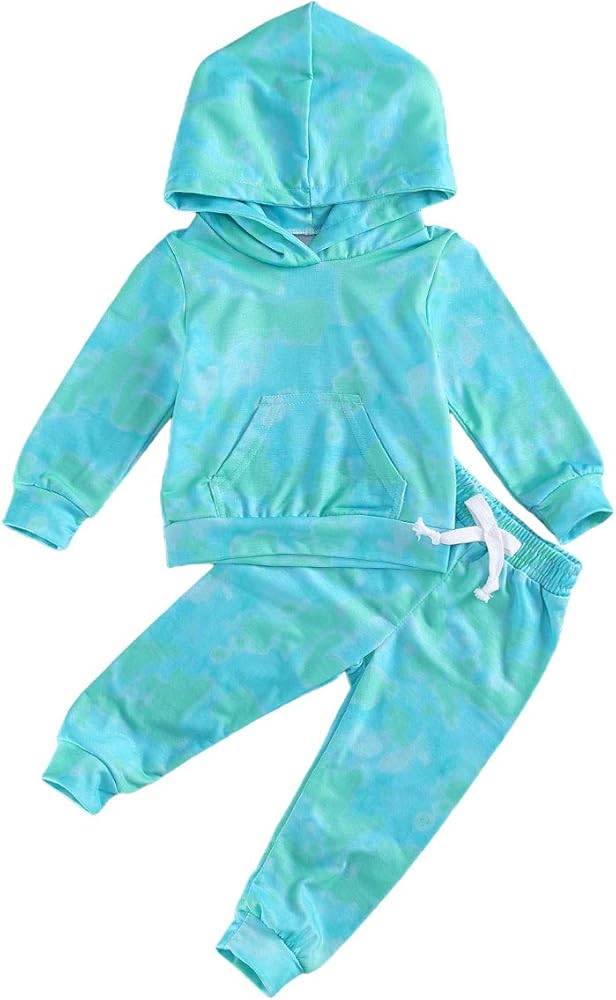 Style: Cute 2pcs kids toddler baby girl tie dye tracksuit, 2020 new fashion tie dye digital print, long sleeve, crewneck pocket sweatshirt top and sweatpants jogger pants set, perfect little girls casual holiday clothing