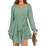 Features: lantern sleeve dresses, square neck, womens mini long sleeve dress, above knee-length, Zipper at back, flowy ruffle hem, A line, tie waist, and the tie helps create a nice waistline.