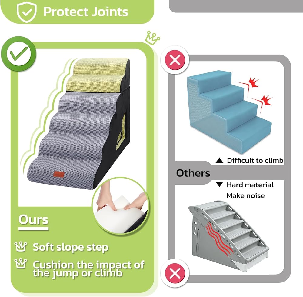 【Dog Stairs - Easy to Up and Down】: Our dog stairs for high bed helps your small furry friend more convenient to get on and off bed or couches. Compared with the dog stairs that has sharp angle, the soft slope design is more friendly for the pets' knee in their many jumps, protects leg joints.