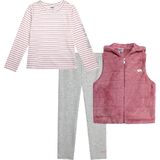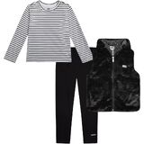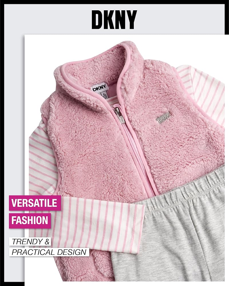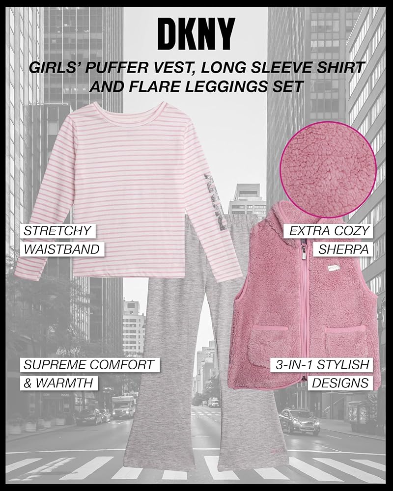 3-IN-1 STYLISH DESIGN: Transform your girl's wardrobe with this DKNY Girls Puffer Vest Set. This 3 piece outfit includes a trendy zip-up puffer vest, a soft sweatshirt, and matching leggings, offering a complete look that's both practical and stylish. Whether layered together or worn separately, each piece in this cute matching set enhances your little one's style. Perfect for mixing and matching with other cute baby girl clothes, this girls' clothing set is a must-have for little fashionistas.