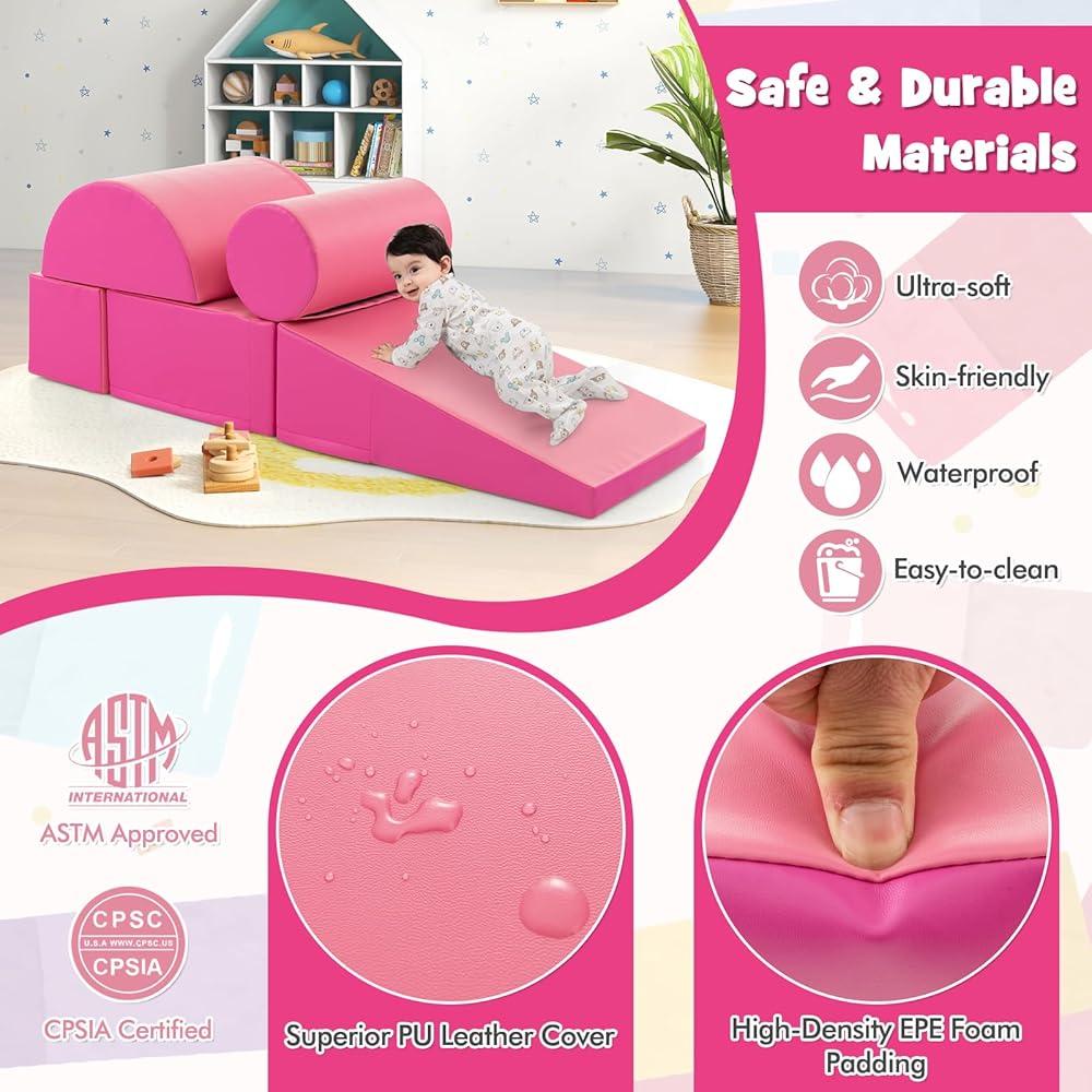 【Easy to Clean and Maintain】: The 5-piece climb and crawl playset is covered with a waterproof and easy-to-clean PU leather, making it simple to wipe away spills or dirt. The covers are also removable and machine washable, ensuring a hygienic and fresh play surface for kids.