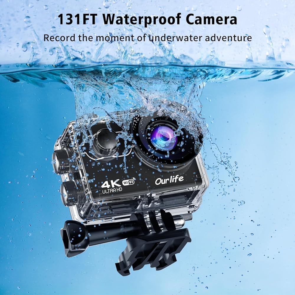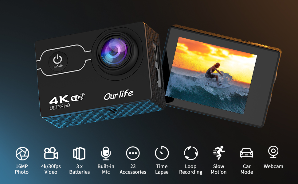 HD Video and Photographs Shooting:Ourlife 4K action camera features 4K/30FPS, 2.7K/30FPS and 1080P/30FPS video resolution and 16MP photos, Ourlife sports camera enables you to take incredible photos and ultra HD video recording for vlogging , clearly recording the beauty and wonders in life!