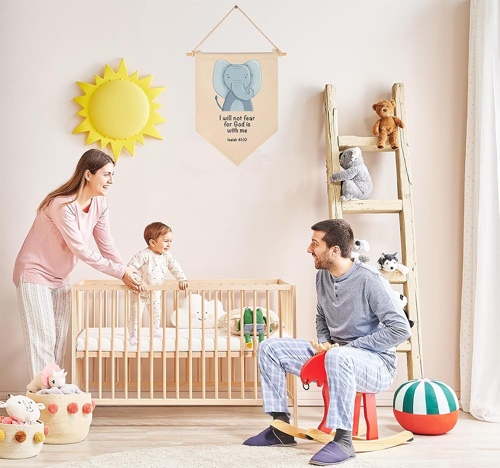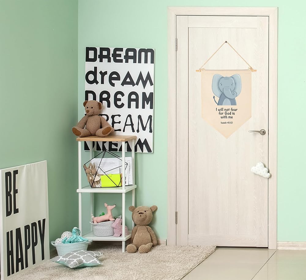 Our natural beige banners are made of high quality cotton canvas , strong and lightweight,blends well on any wall color.They are the perfect wall decor gift for embellishing nursery bedroom playroom reading corner door,front porch, living room,office,bedroom,hanged onto anywhere in your home, and great gifts for baby newborn kids girl boy teen,baby showers, birthday,christmas,new year.