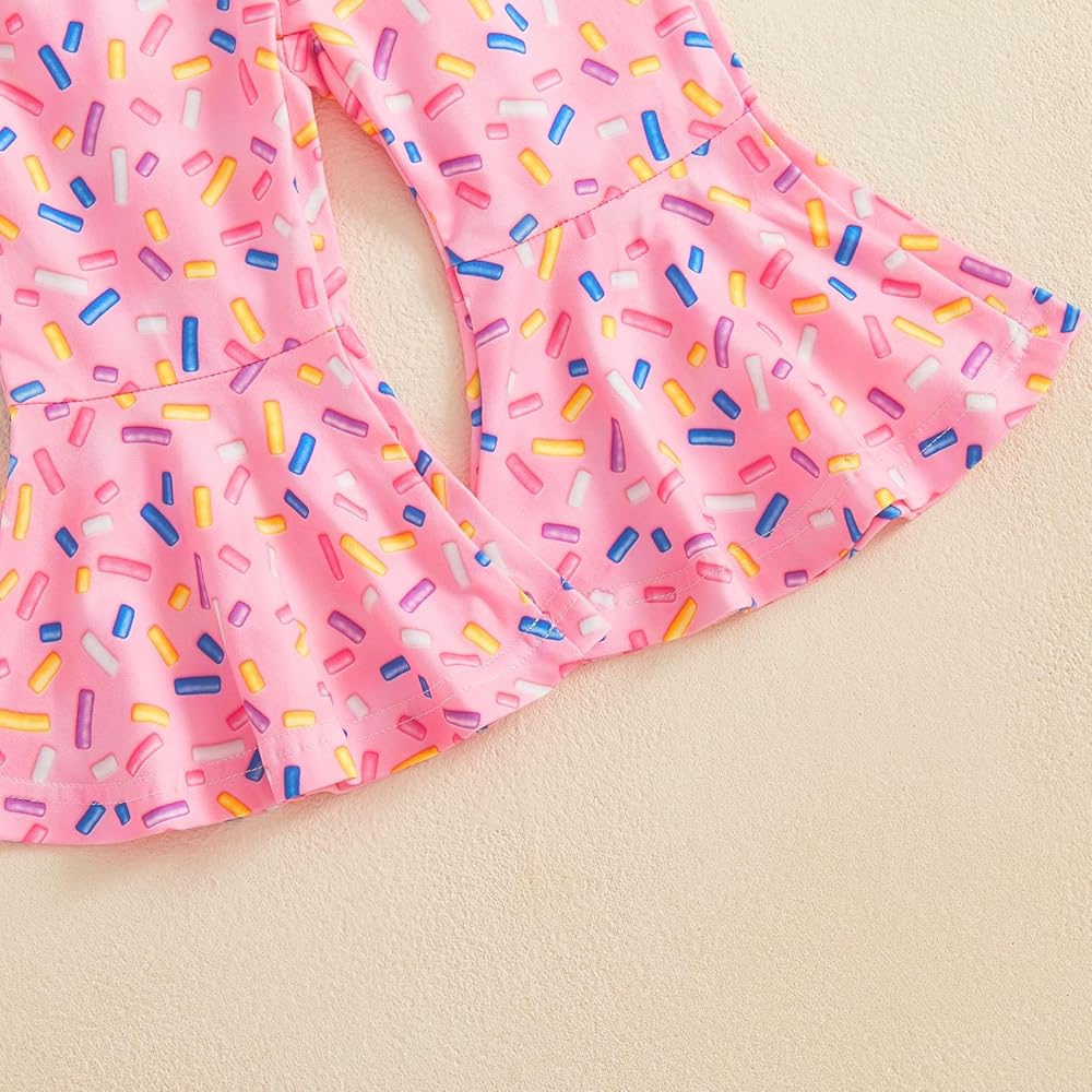 DESIGN: Finest 1-5 years old girl birthday outfit. Spring/summer/fall/winter wear, short sleeve, fashion candy print, embroidered sweet one/two/three/four/five pattern, delicate flare bell bottom pant design. Toddler girl birthday girl shirt