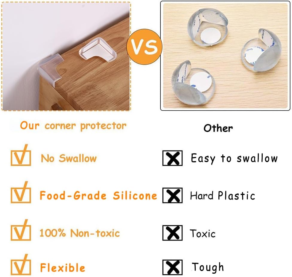 Food-Grade Silicone Material: Made of Soft high-temperature-resistant Silicone (Adhesive Except), Offer 5x cushion, softer and thicker than normal PVC corner protectors. Unlike the foam material, it can not be tore easily by babies and children, but also provide with flexible proofing guard for baby safety.