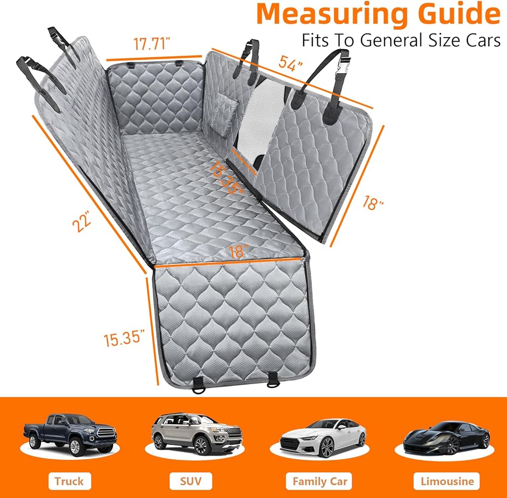 Perfect Fits Your Car - Perfect size of 54"W x 58"L fits different vehicles like cars, trucks, SUVs! Supplies your pets with comfort while keeping your vehicle interior safe from scratches, fur, and urine (100% waterproof). It also perfects for protecting cars from damage caused by baby car seats. And for kids, it can protect the back seat from food and juice spills.