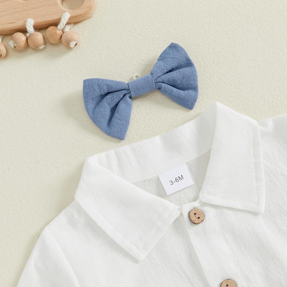 2-Piece Newborn Outfits Baby Boy Dress Clothes Suit Button-up Bow Tie Long Sleeve Lapel Neck Romper Bodysuit + Long Overall Pants Infant Gentleman Outfits Formal Wedding Photograph Fall Winter Spring Clothing Set