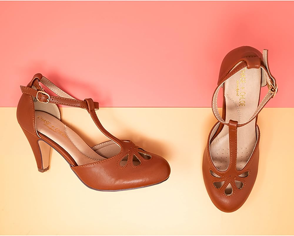 Chase & Chloe Women Mary Jane Oxford Pumps - Cute Low Kitten Heels - Retro Round Toe Shoe with Ankle Strap