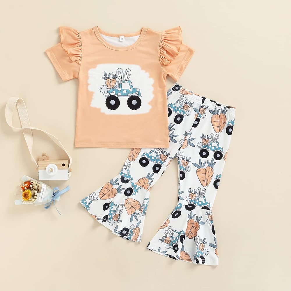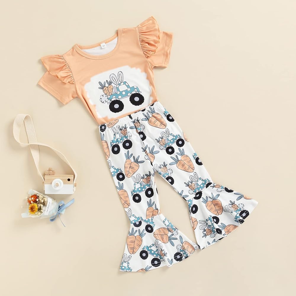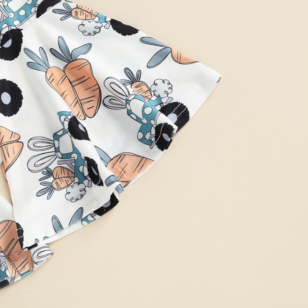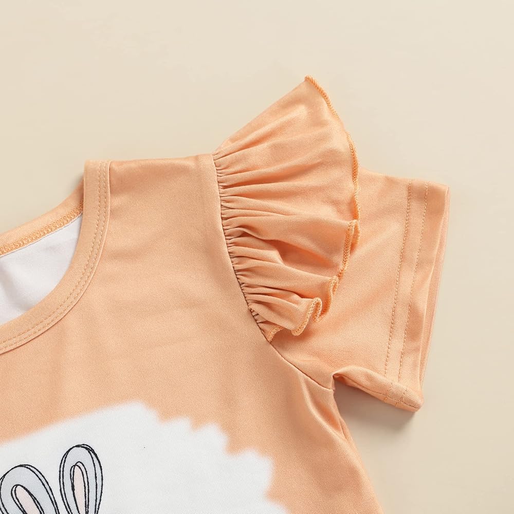 [Design]2Pcs baby girl bunny shirts with ruffle pants Easter clothes set, Easter T-shirt with flare pants, short sleeve T-shirt with bunny pants, crew neck, elastic waist, ruffle shoulder and hem, full of cartoon rabbit bunny patterns and creative lines are super perfect for the Easter Day, makes your baby easy stand out on this Easter.
