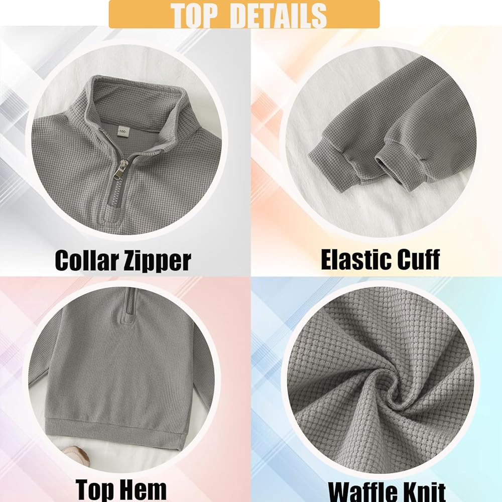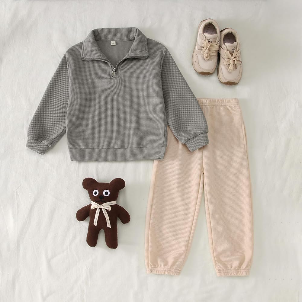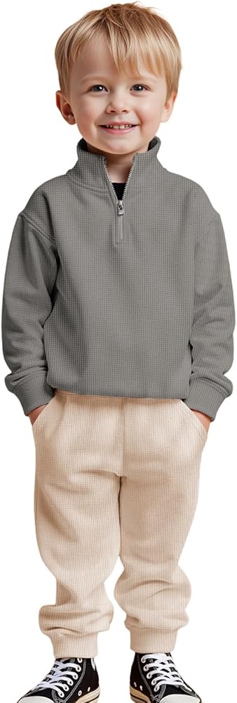 【Design】Toddler boy fall outfits, classic waffle knit solid colored long sleeved pullover tops with a zippered collar design, making it easier to put on and take off; toddler boy winter clothes matching solid colored waffle knit pants in different colors which have elastic waist and two side pockets. This toddler baby boy's outfit will make your little boy cool and fashionable.