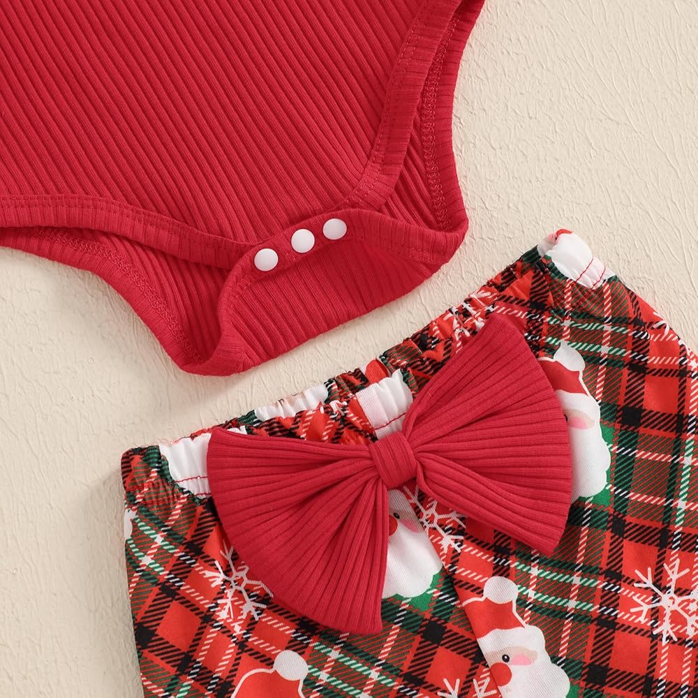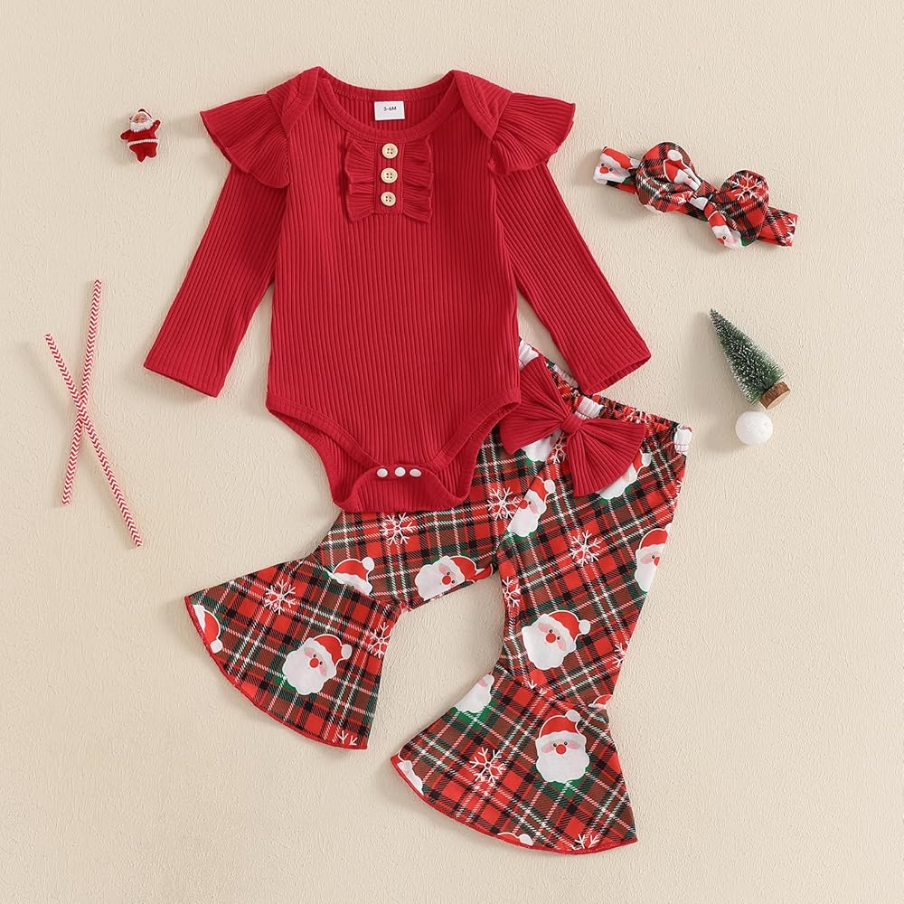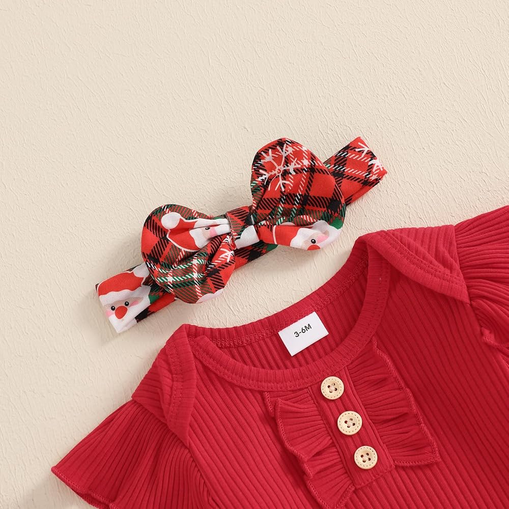Features: Newborn baby girl Christmas outfits, fly sleeve/ long-sleeved round neck button romper, matching with elastic waist bell bottom plaid flare trousers and bow headband
