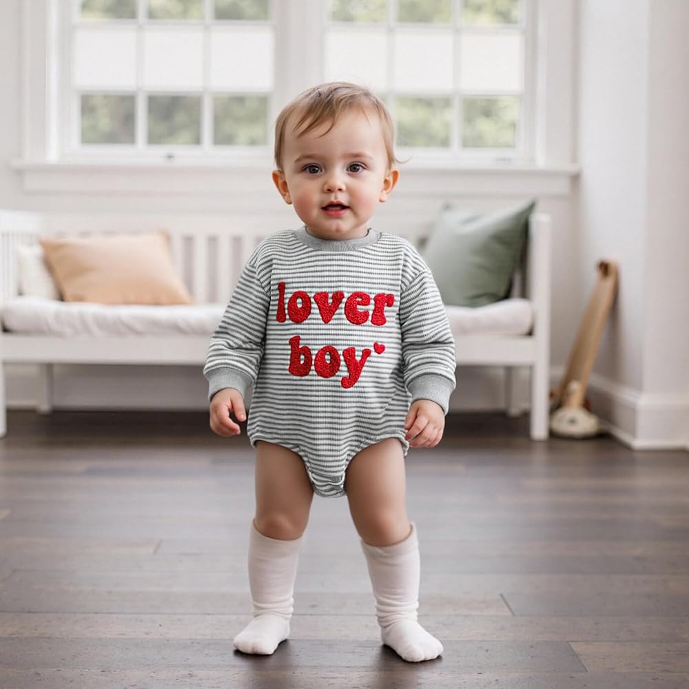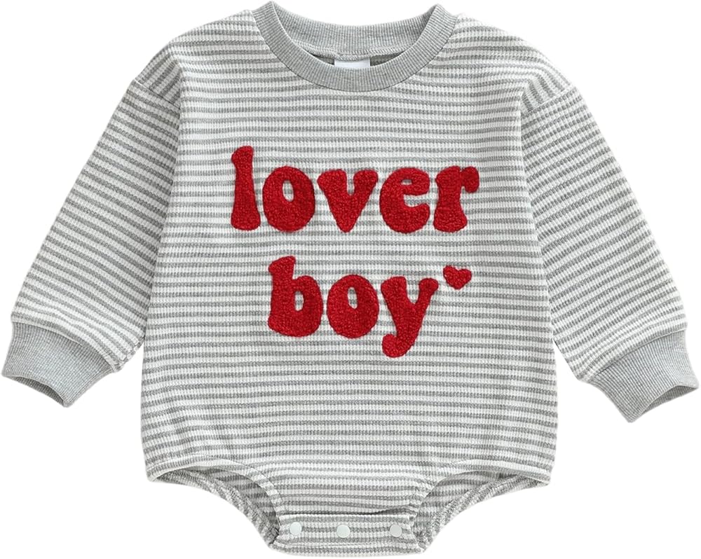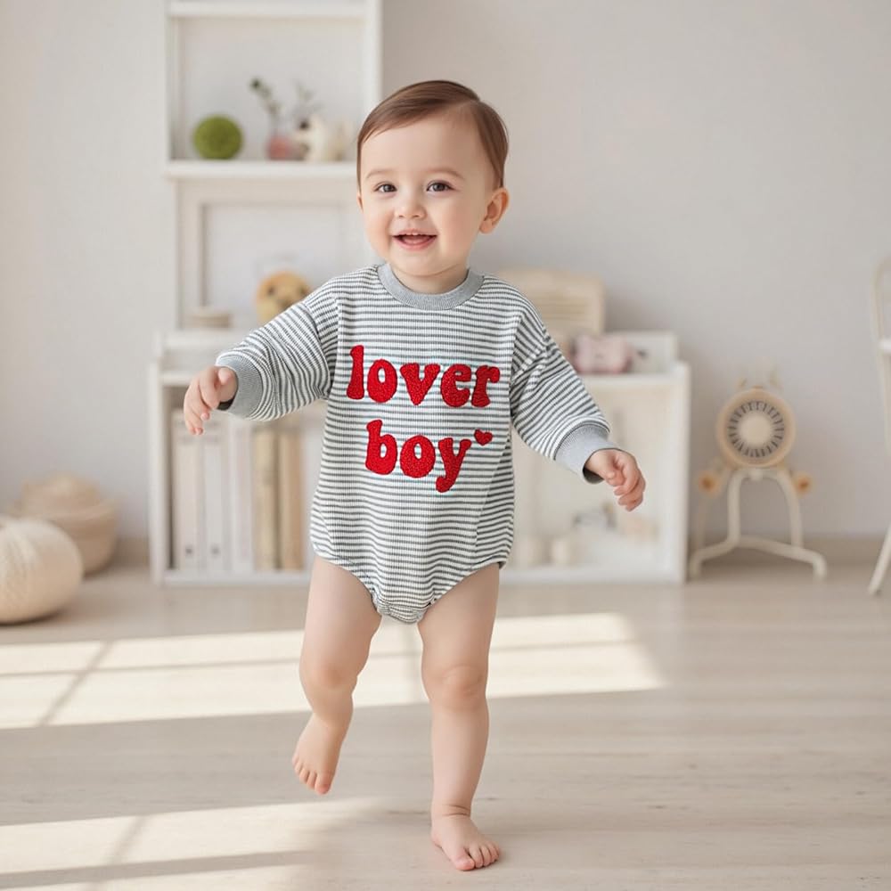 DESIGN: Newborn baby bubble romper sweater top, long sleeve, embroidery "lover boy" letter printed and heart design, snap button for easy changing diaper, baby girl boutique clothing, Valentines Day Romper Sweatshirt,baby girl photoshoot outfits, baby girl summer clothes. Bright colors make your baby look more eye-catching and cute!