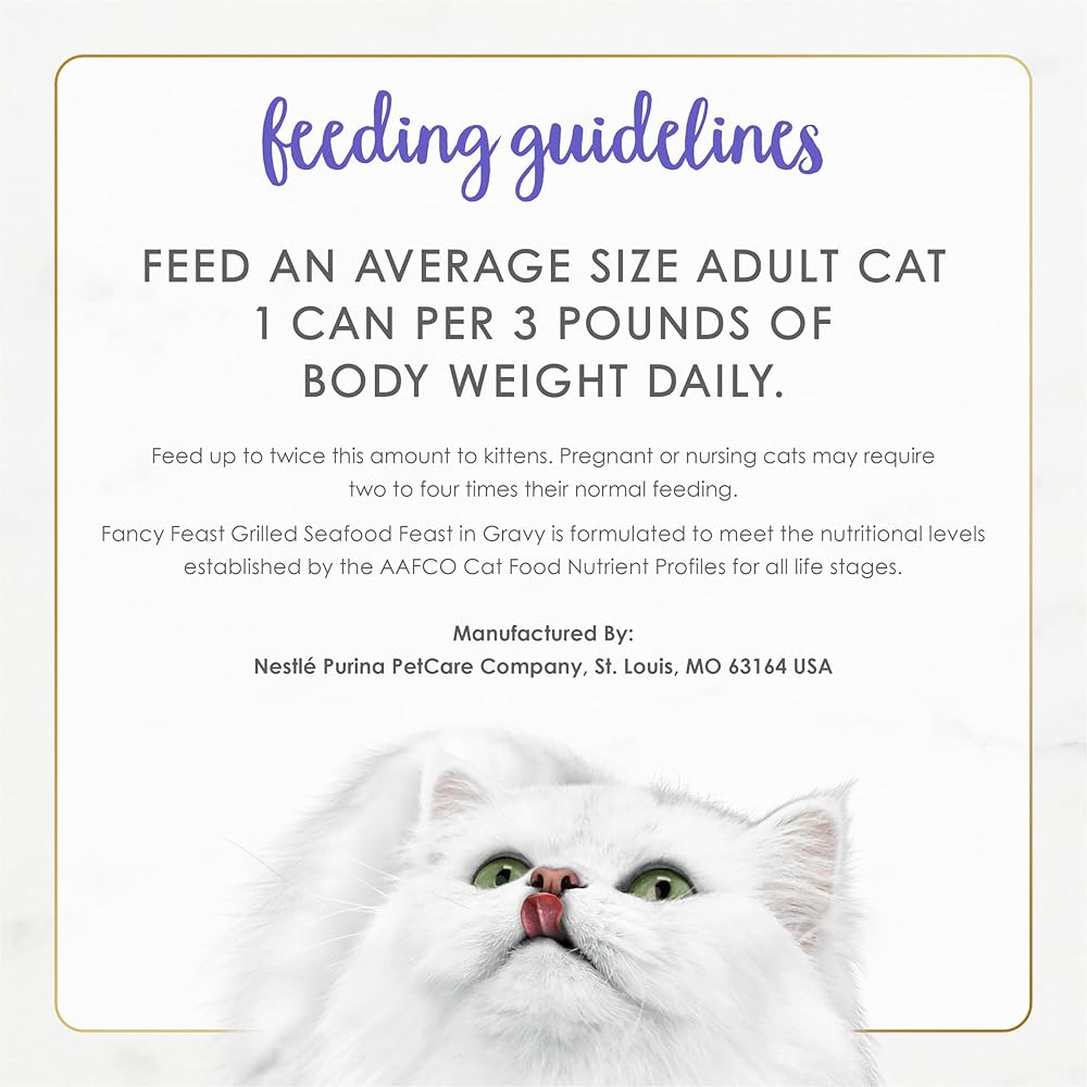 Satisfy your cat's craving for seafood with Purina Fancy Feast Classic Ocean Whitefish and Tuna Feast wet cat food. This enticing blend of ocean whitefish and tuna creates a delicate taste your choosy cat is sure to love, and the classic pate texture is smooth and soft, creating a pleasurable dining experience. Watch your cat revel in the exceptional taste found in each bite, and rest easy knowing you are giving her a grain-free cat food made with high-quality ingredients. Each serving contains complete and balanced nutrition to support her playful lifestyle, so you can feel good about filling her dish at mealtime. Show your cat that her happiness is at the top of your priority list when you feed her this delectable gourmet pate cat food and explore our other canned cat food varieties to give her a selection of flavors she'll fall in love with at mealtime. Try Purina Fancy Feast wet cat food today, and show your furry friend just how much you care.