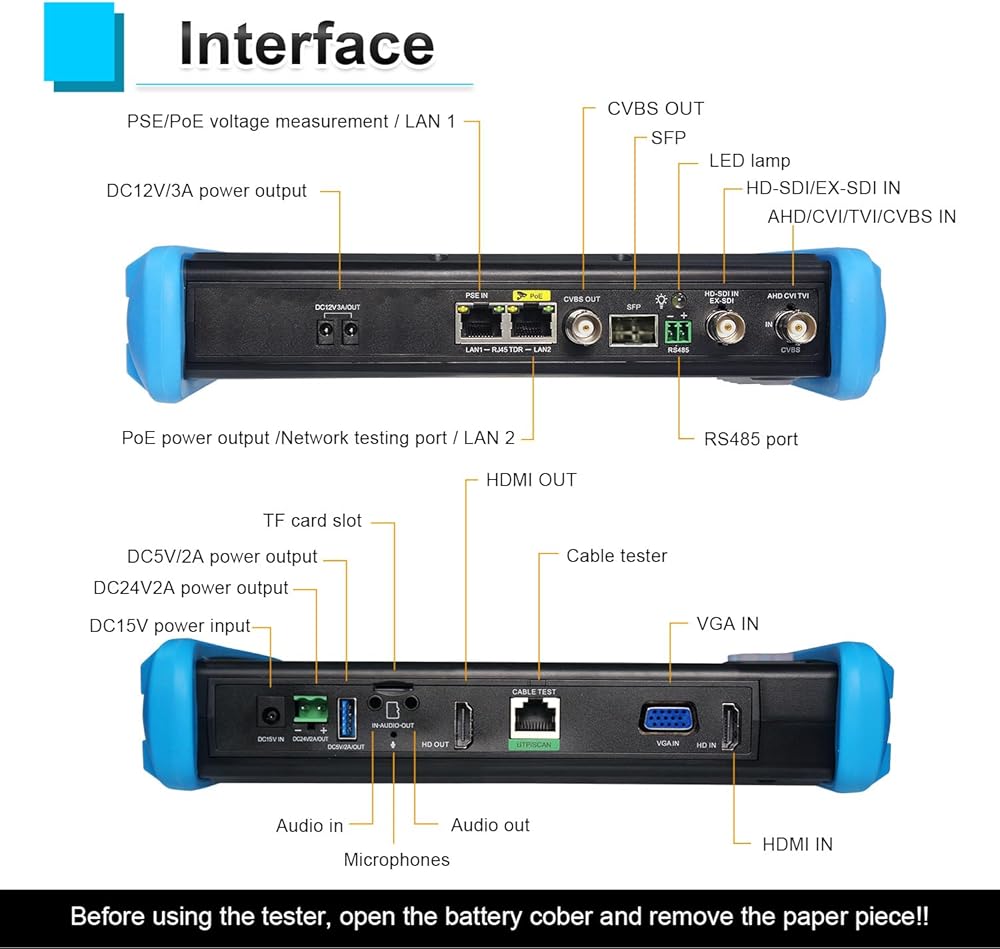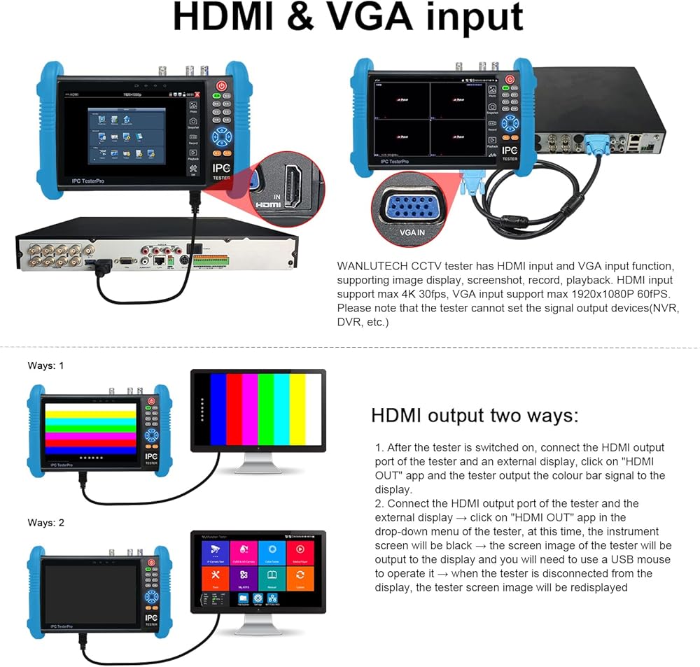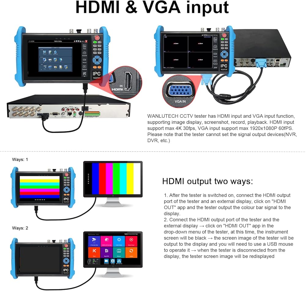 [ AHD TVI CVI SDI Camera Tester ] WANLUTECH IP camera tester with poe support to test max 8MP SDI/AHD/TVI/CVI/CVBS camera. Using "AUTO HD" app can automatically recognize AHD CVI TVI CVBS cameras and display resolution and frame rate on the screen, supports UTC control & call OSD menu, menu settings, screenshot, video recording, video playback, etc. Support color bar generator, output one channel PAL/NTSC color bar video signal