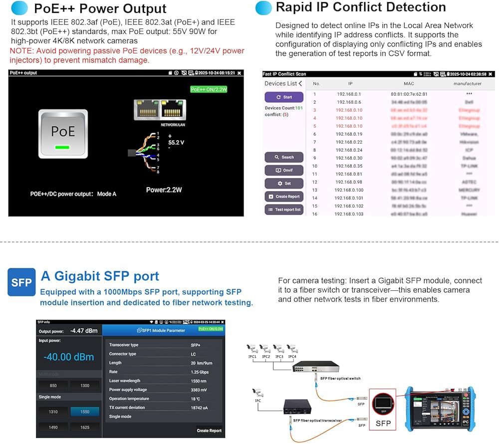 [ PoE & Network Test Tools & WIFI ] IP Camera Tester with PoE, support PoE IEEE802.3af/at , max 48V, power output 30W. Network Test Tools: built-in porfessional network testing tools,such as Ping, IP scan, DHCP server, PPPOE, Trace Route, Port Flash, LLDP, Link Monitor, etc. WI-FI analyzer (2.4GHz frequency band) support to analyse wi-fi signal strength,channel,channel level, support create WI-FI hotspot
