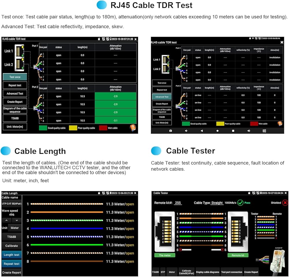 [ Cable Tester ] RJ45 Cable TDR Test: it can test cable pair status, length, attenuation, reflectivity, impedance, skew. UTP Cable Tester: test UTP cable connection status and display on the screen, support detect the near-end, mid-end and far-end fault point of the RJ45 cable plug. Cable Length Test: Measure the breakpoint position of (open circuit status) BNC cables, RJ45 network cables, RJ11 cables