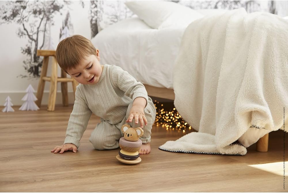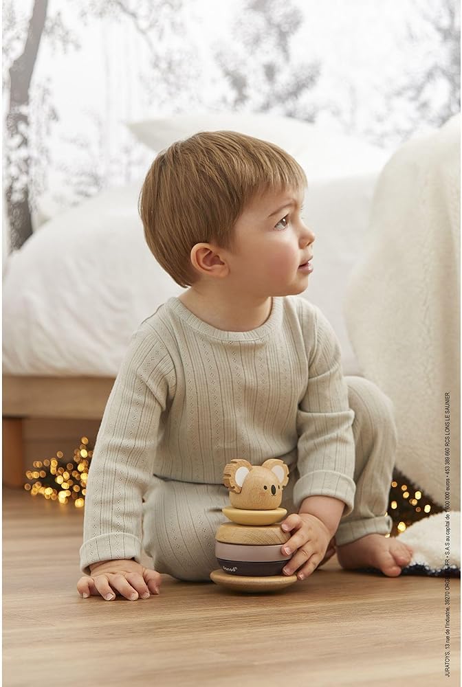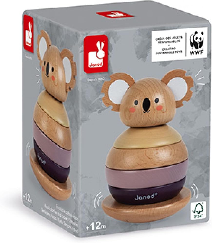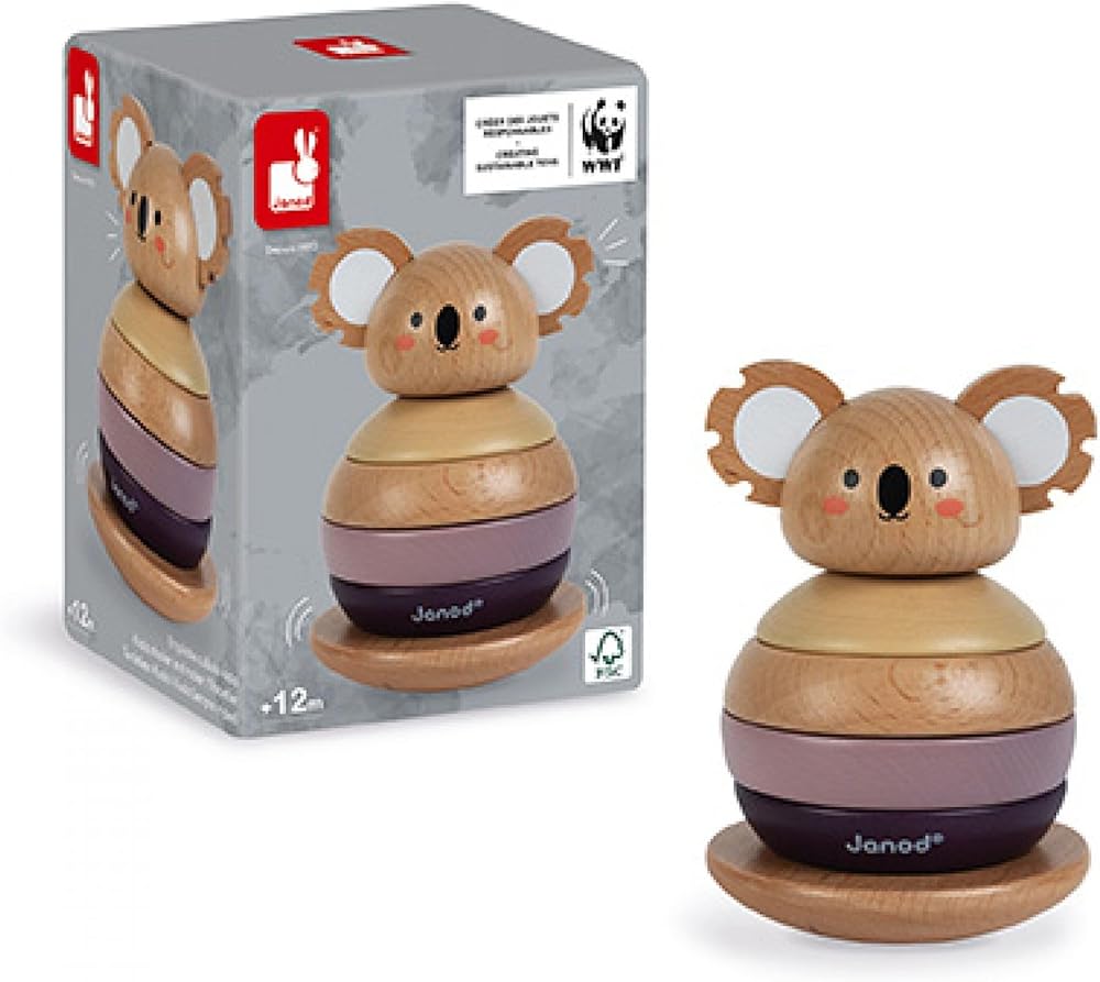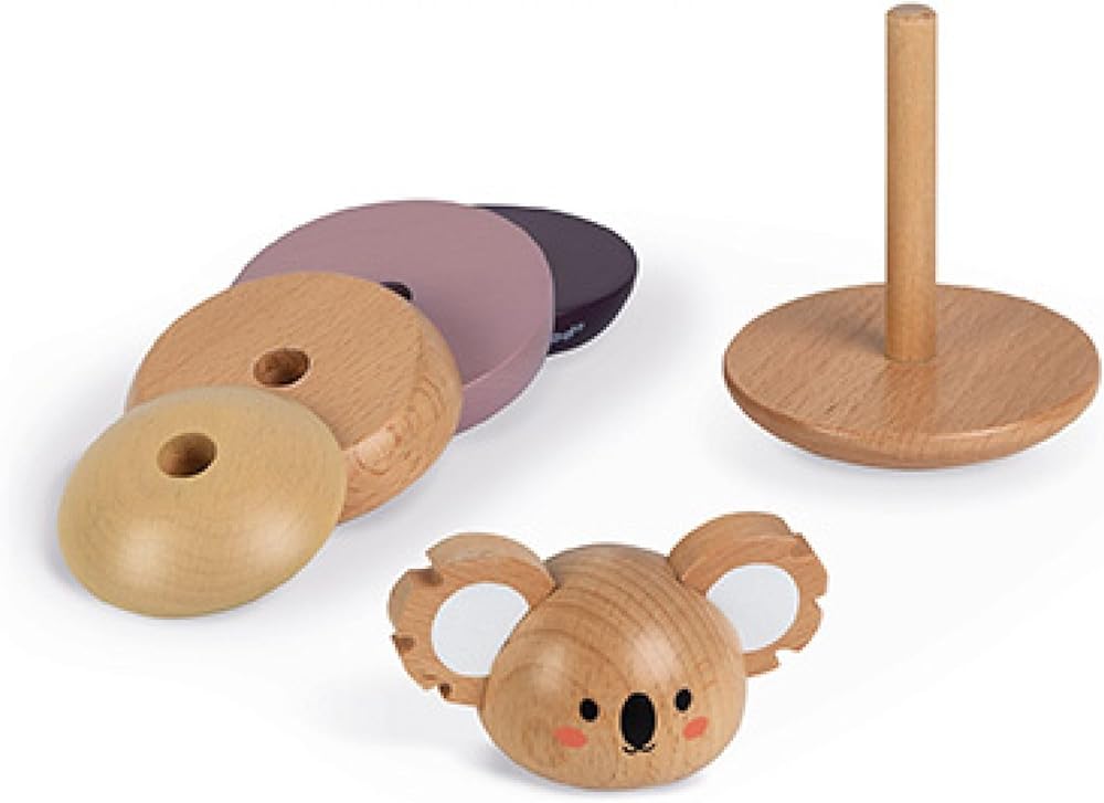 INCLUDES 4 WOODEN RINGS, HEAD, AND BASE-- All Janod pieces are painted with non-toxic water-based paints and lacquers. Wipe clean. Sturdy construction meant to last for generations. Koala measures approximately 5.2” tall.