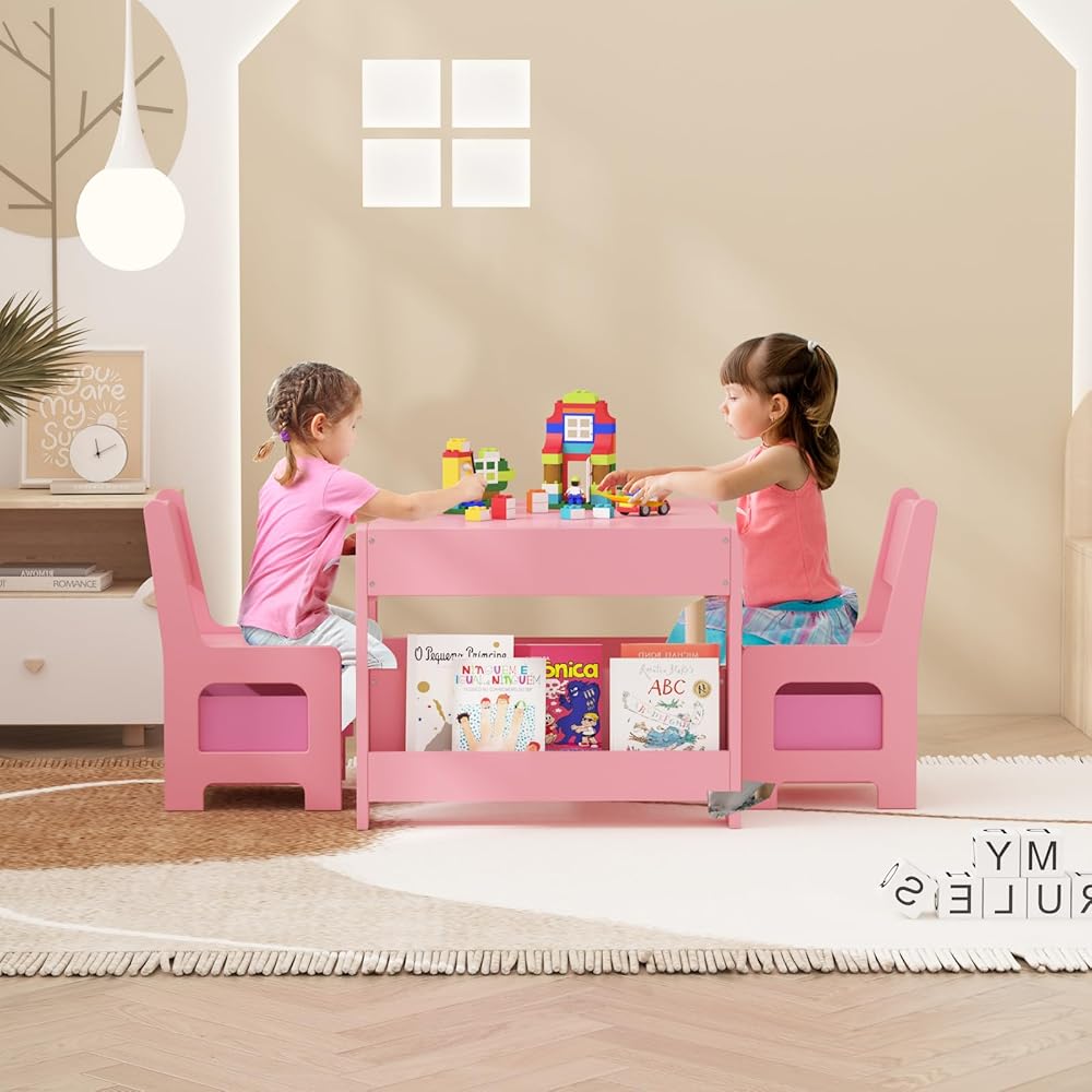 【Multifunctional table and chair set】: The children's table and chair set includes 1 table and 2 chairs. One side of the tabletop is a blackboard for drawing and writing with chalk, and the other side is a whiteboard for learning and playing. There are also 3 storage compartments next to it to place things. It is very suitable for painting, reading, handicrafts, art, etc. There are 2 compartments on both sides of the table, which can be used as bookshelves to meet your child's various daily need