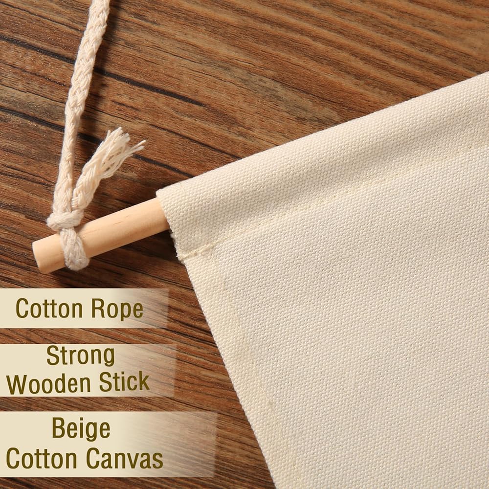 Premium Canvas: Made of cotton canvas in a natural,with 1 tough twine and 1 strong Wooden stick; It's very lightweight so can hang on a thumbtack