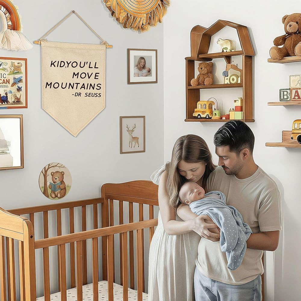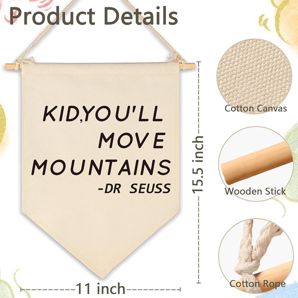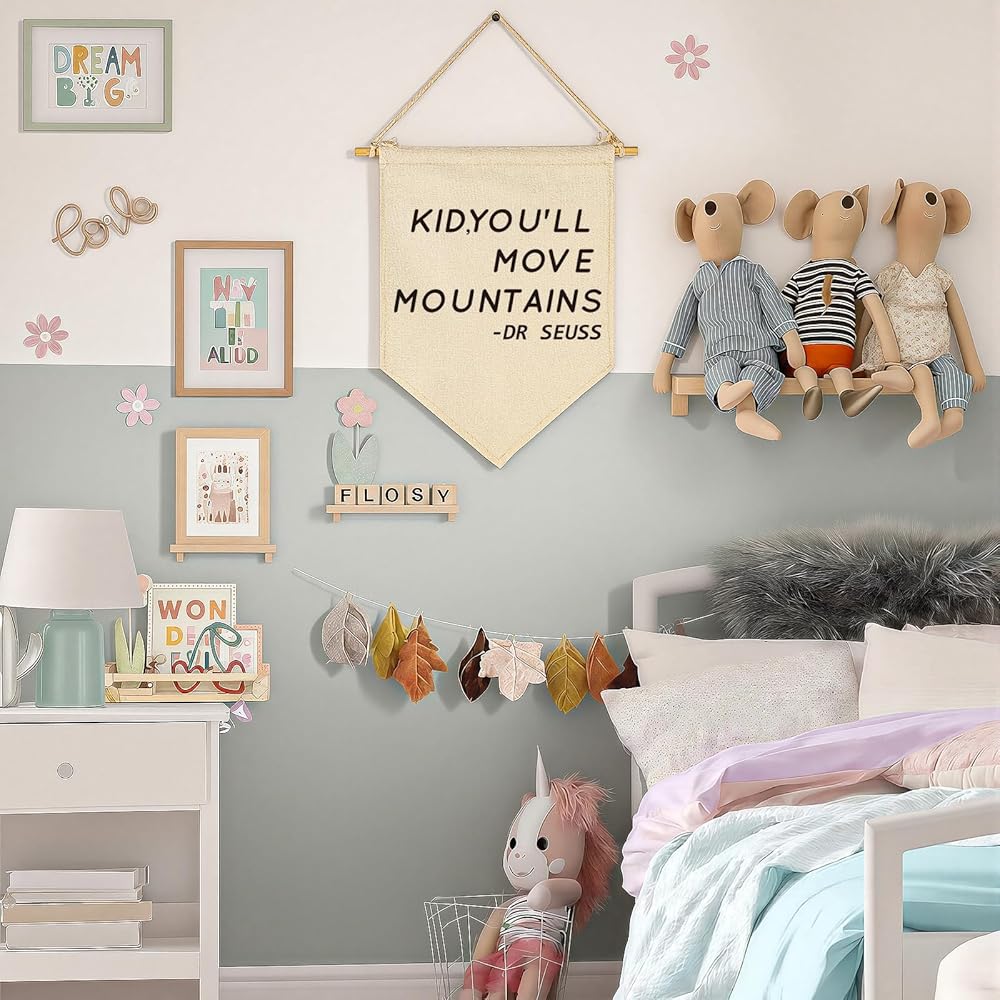 Kid, You'll Move Mountains-Nursery Wall Art Décor-Canvas Hanging Pennant Flag Banner Wall Sign Decor Gift for Kids Boy Girl Teen Nursery Bedroom Game Room Playroom Decor-Birthday Christmas Gift
