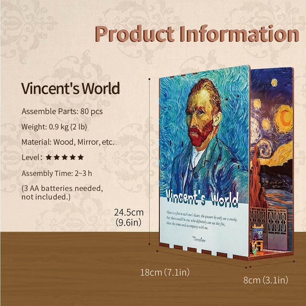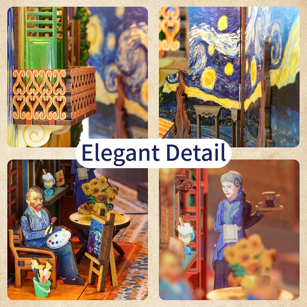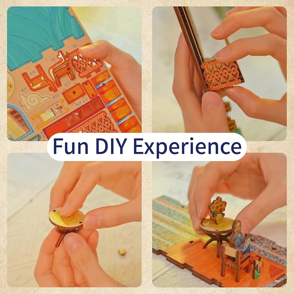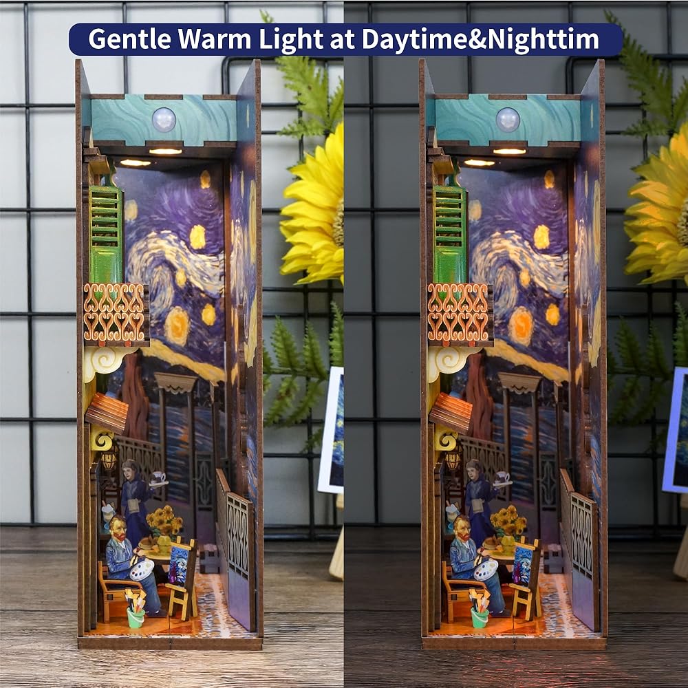 Auto Sensor Light: Tonecheer book nook DIY kits for adults features smart auto-sensing light which turns on when you approach, and automatically turns off after 1 to 2 minutes. The sensing distance of body varies between 0.5 to 3 meters, depending on the changing of environmental temperatures. The comforting warm light creates a dream-like atmosphere, bringing you a sense of ease and peaceful mood.