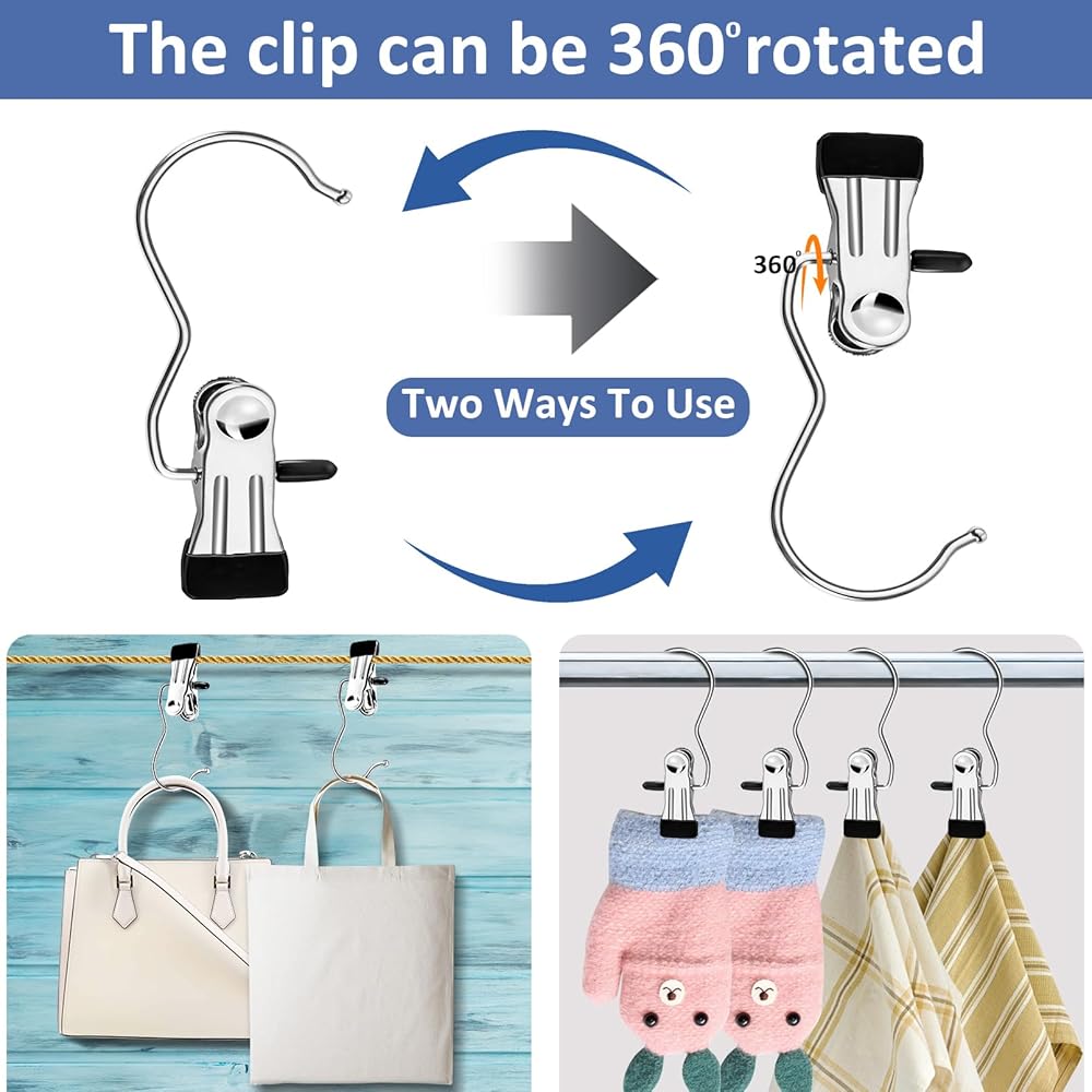 360° Rotating & Multipurpose: Hangers single clip can be rotated 360°, you can use it as both clips and hook. As a clip to hang boots, hats, socks, scarfs, etc, also as a hook to hang handbags, cleaning cloth, cleaning brushes, towels, etc.