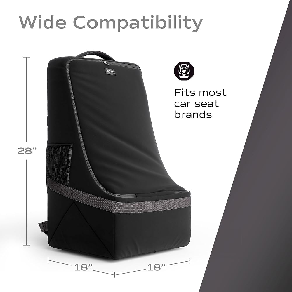 Compatible with: The Koah Portable Car Seat Backpack is compatible with most booster, convertible and infant car seats. It has a dimension of 18 x 18 x 29 inches.
