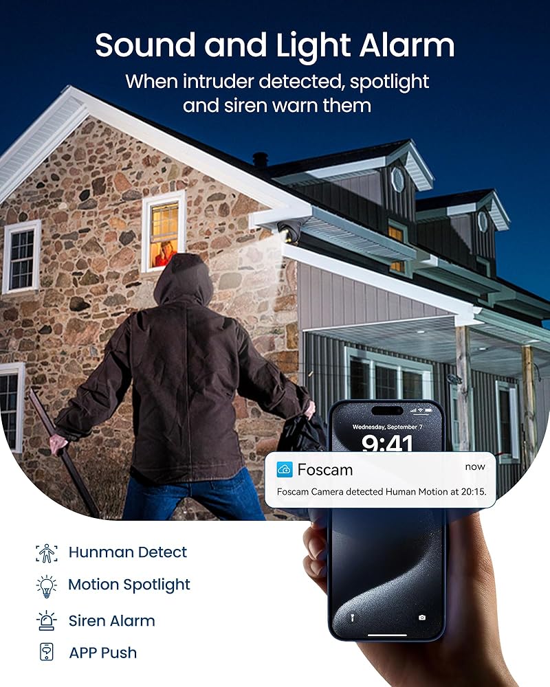 【Motion Detection Alarms】Foscam T8EP outdoor security camera supports human detection, motion detection and vehicle detection.Once an intruder is detected, the camera's spotlight and siren will be triggered to warn potential threats.