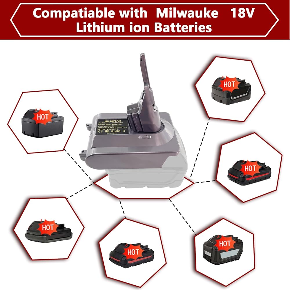 Compatible with Milwaukee M18 18 volt lithium-ion Compact and XC Cordless Tool Battery Packs 48-11-1862, 48-11-1850, 48-11-1840, 48-11-1835 etc High Output Battery. (Recommend to use 4A and above batteries because of the high power for Dys vacuum.)