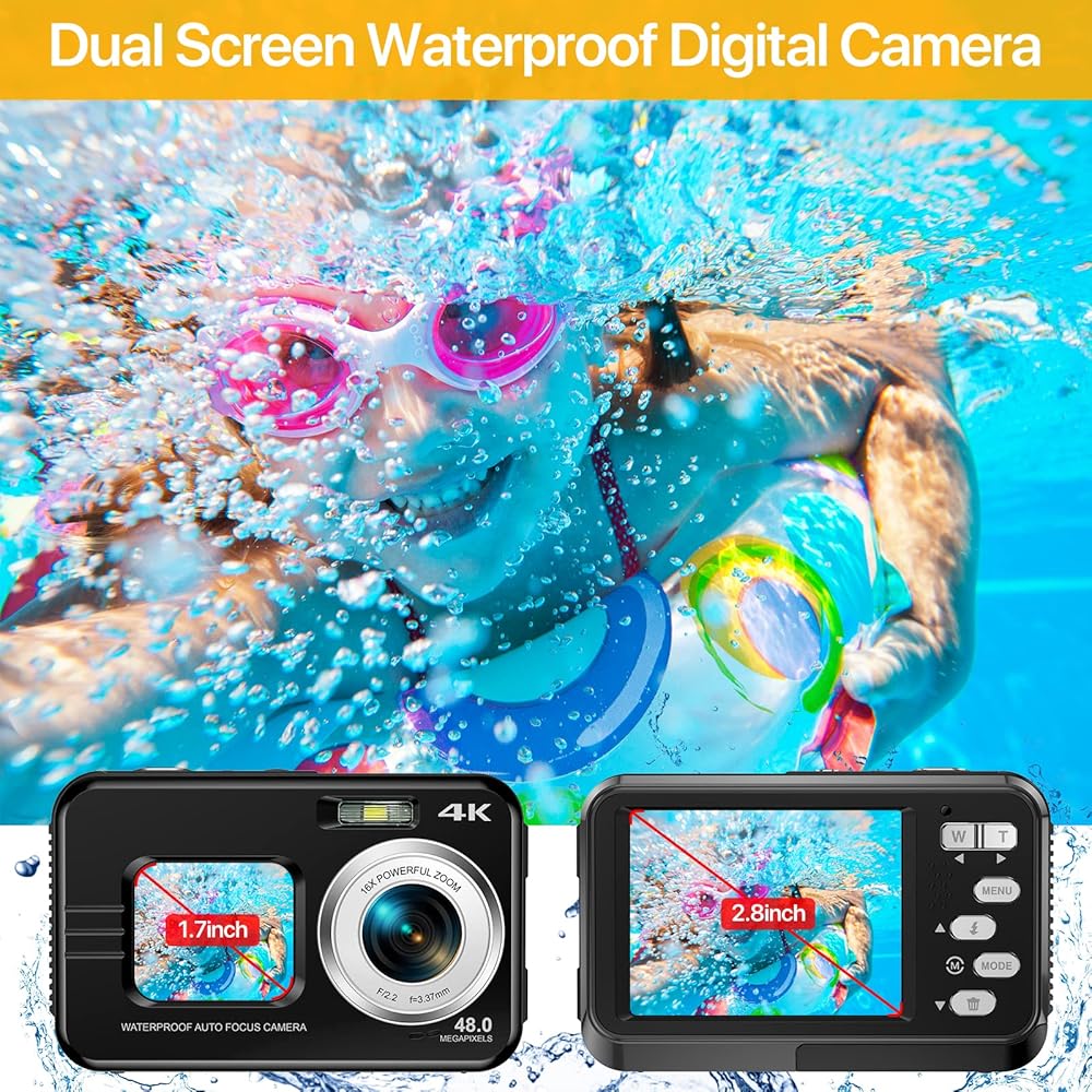 4K Underwater Camera with 64GB Card, 11FT Waterproof Camera Dual-Screen Selfie Underwater Cameras for Snorkeling 16X Digital Zoom Waterproof Digital Camera 2 Batteries (Black)