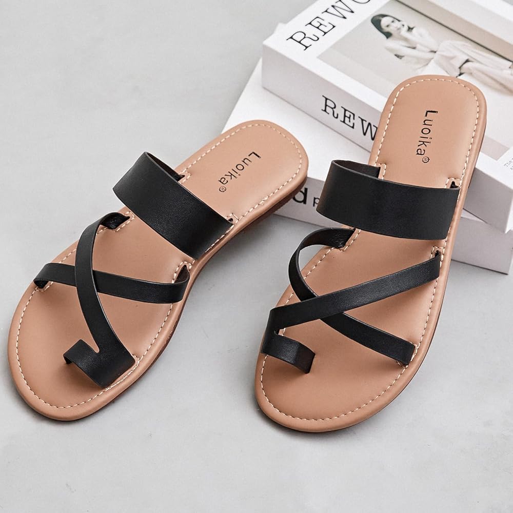 Luoika Women's Wide Width Flat Sandals, Flip Flop Slides Sandal Casual Strapy Sandal Slip on Summer Beach Shoes for Women.