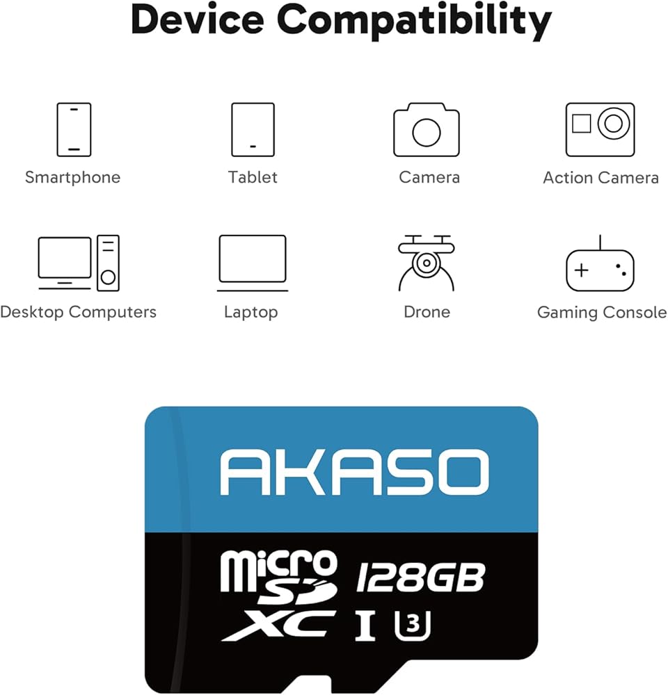 AKASO 128GB microSDXC U3 Memory Card with Adapter - Up to 100MB/s, UHS-I C10, U3, Full HD, 4K UHD, MicroSD Card