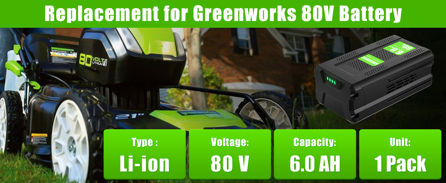 ⚡【High-capacity Battery】Replacement for Greenworks 80V battery | Battery type: Li-ion | Voltage: 80V | Capacity: 6000mAh | Package includes : 1 X Replacement for Greenworks pro 80v battery.