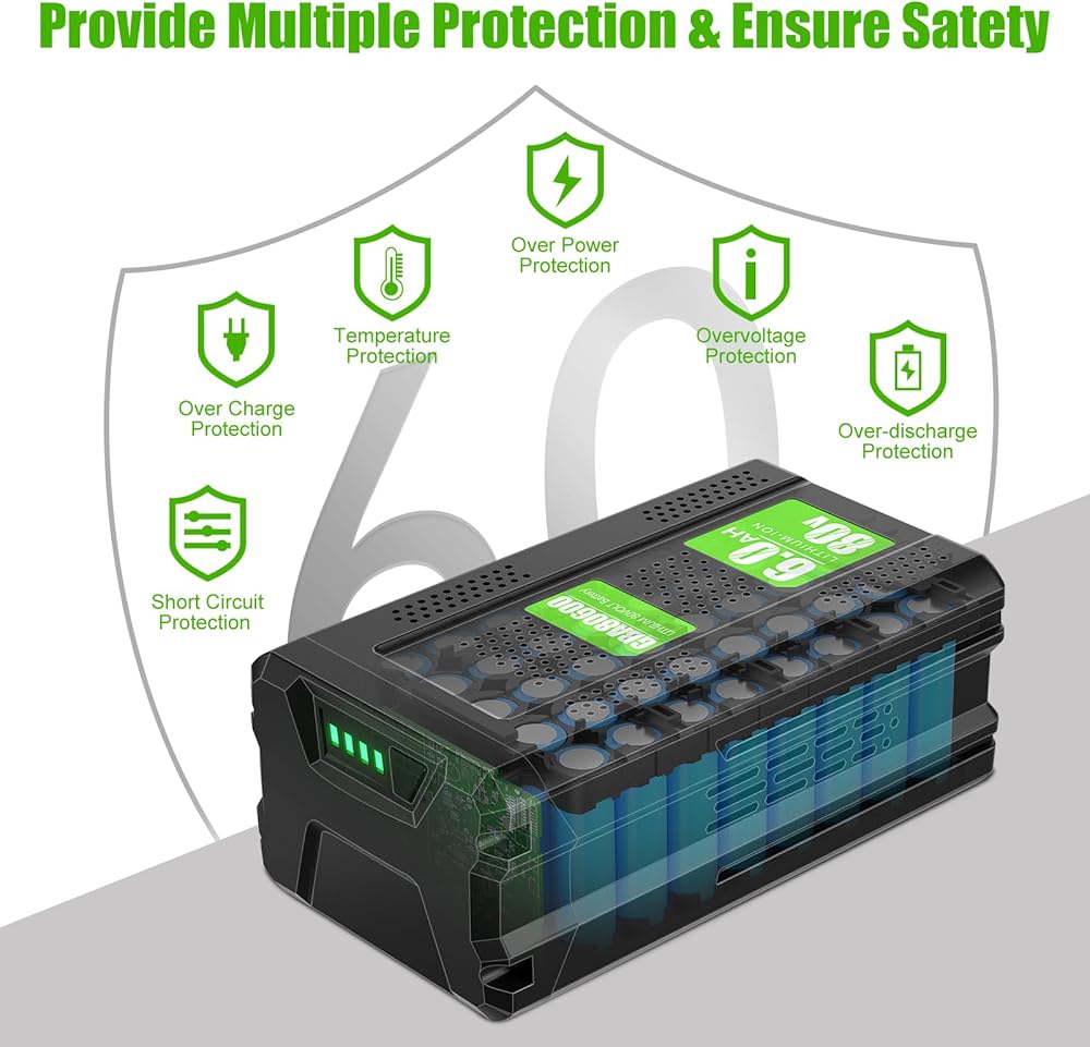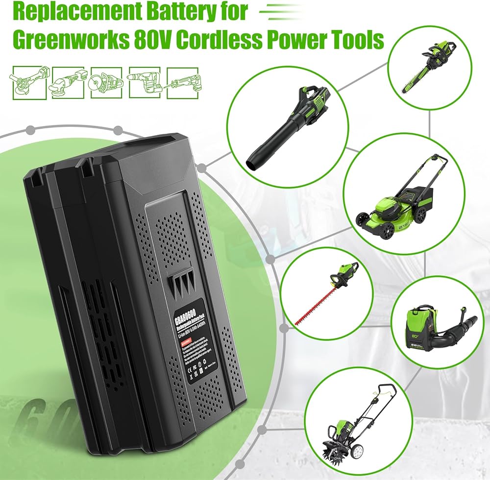 ⚡【Multiple Safety Protections】The 80V battery for Green works has overcharge, over-discharge, over-current and overvoltage protection systems to ensure safety and extend battery life. NOTE: The replacement for Greenworks 80 volt battery has overheating safety protection, avoid recharging immediately after a full discharge.