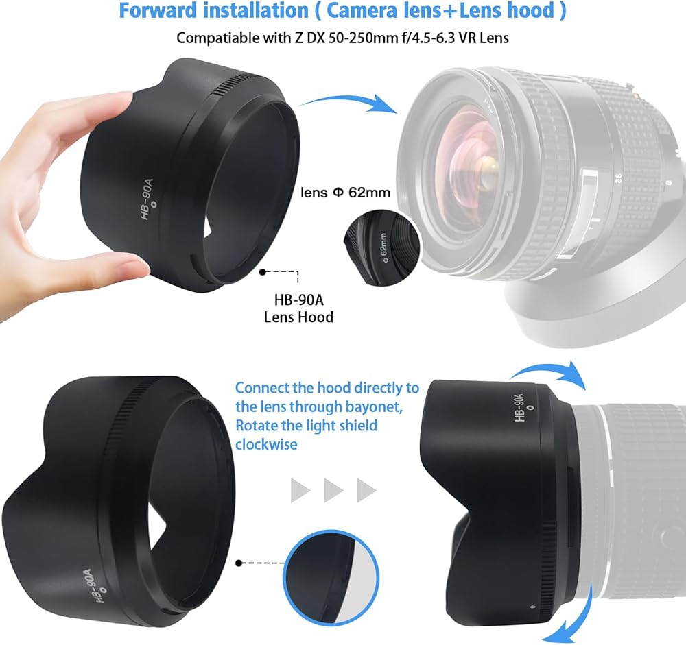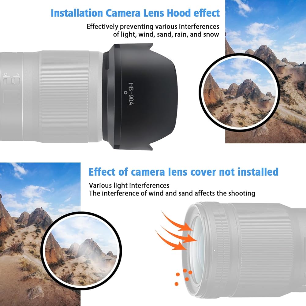 The HB-90A Lens Hood is dedicated to Nik/Z DX 50-250mm f/4.5-6.3 VR lens.It made of high-quality ABS material, lightweight and durable.Reversible design could be storage easily.The lens hood can not only protect your pictures from harsh light,can decrease reflection to improve image qualityCan keep rain and snow away from the lens and avoid fingerprints from smudging the lens for better care for your camera Useful accessory for photographer lovers