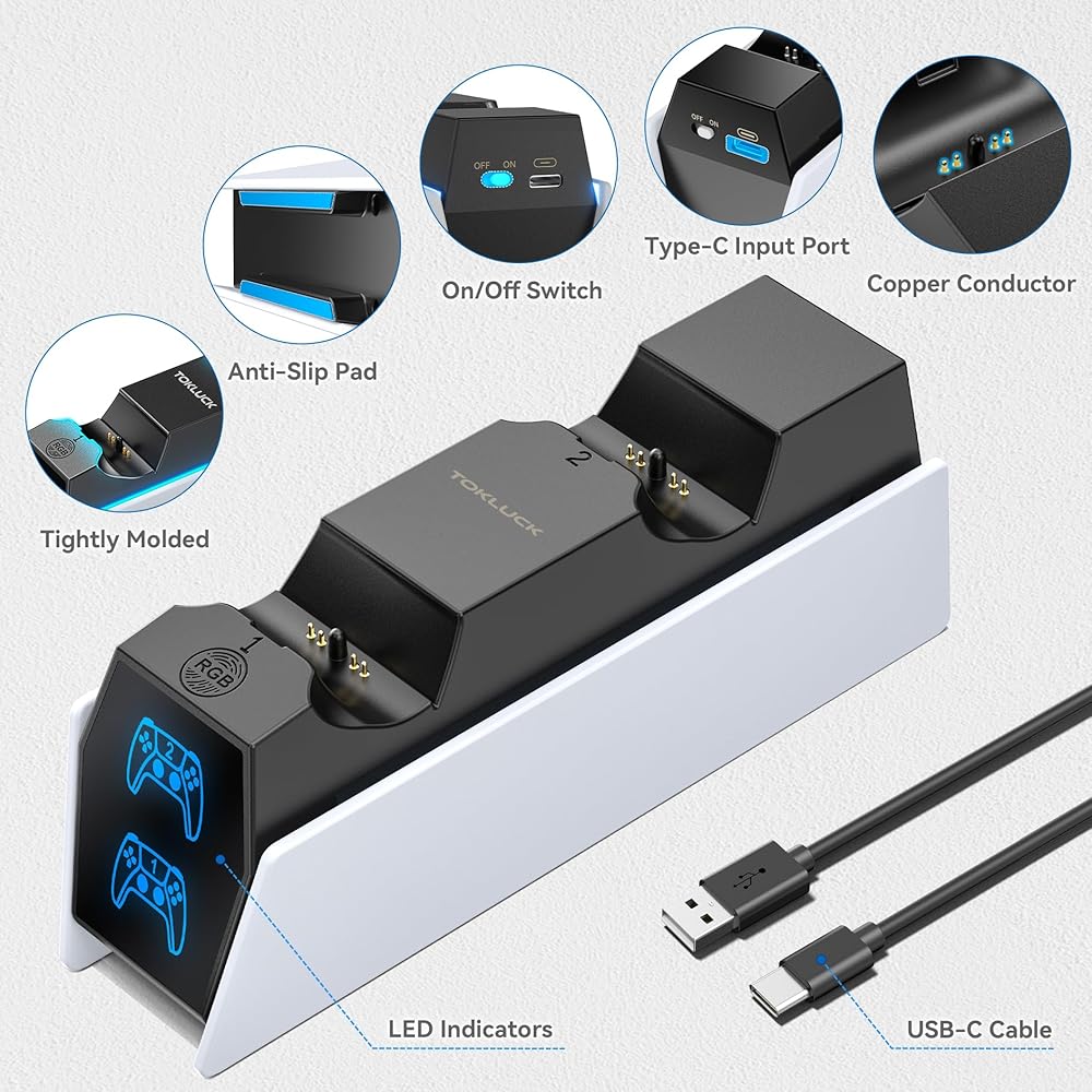Compatible with Dualsense & Edge Controller - PS5 charger is specially designed to charge dual PS5 Edge or Dual Shock controllers simultaneously. Upgrade PS5 charging dock is compact which is say goodbye to messy cables, taking up less space. It's a must have PS5 skin accessories for PS5 controller storage and charging.