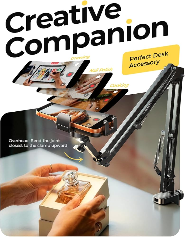 [100% ANGLE ADJUSTMENT AND WIDE COMPATIBILITY BASE] The new generation of mechanically adjustable bases are suitable for most scenarios in life, such as use on tables, bedside, kitchen, baby chairs, sofas, camping, trucks, and more, used as a phone holder for recording,waiting for you to discover applications. Flexible robotic arms can achieve any angle you need during use