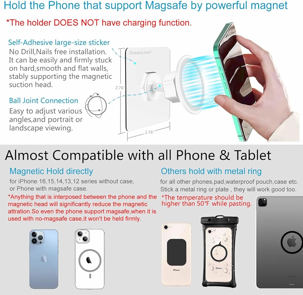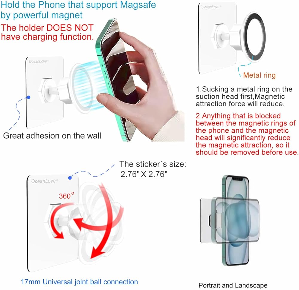 [Powerful attachment of the phone by the strong magnet(Not for charging)]For iPhone 16 15 14 13 12 pro max mini phones and for Magsafe case, This Magnetic for magsafe phone holder can hold them(without phone case) directly, another phone or case need to stick the metal ring(This item includes 1 gift metal ring)on the back of them. Easily placed and taken out with on hand, Easily adjust the phone vertically or horizontally for viewing.Tip: The holder DOES NOT have CHARGING function.