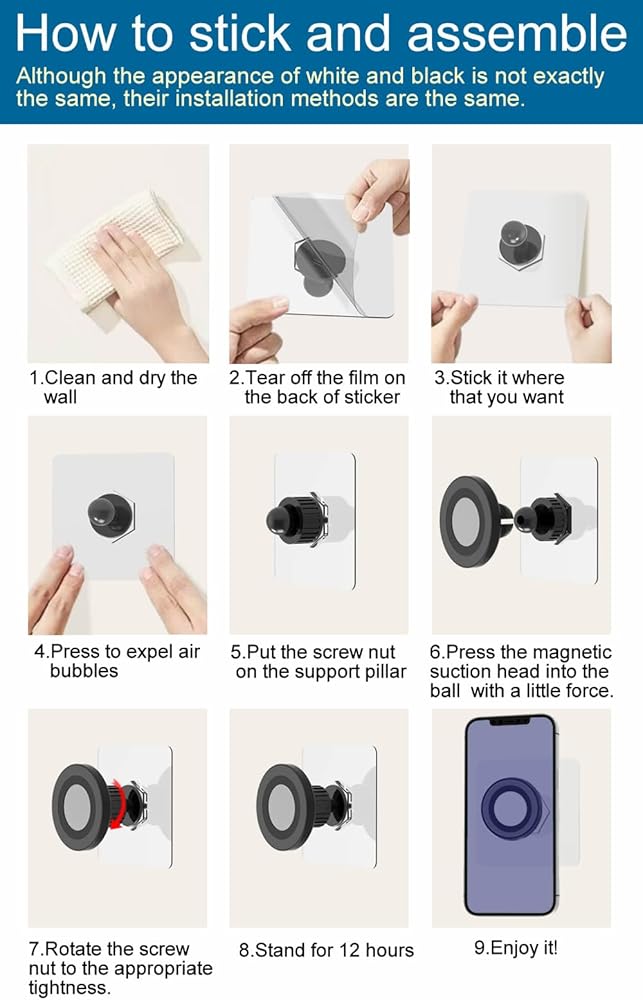 [Eassy to Use and Remove]Just clean and dry the wall,tear off the film on the back of sticker,place it on the wall and press the adhesion base fully and firmly, and then waited 12 hours before using it. To remove it,if it's pasted on the wall for a long time and not easy to peal off. We suggest you to blow hot air with hair drier to dissolve the glue, then it would be tore off easily and no trace.(TIP:Sticker may not be able to be stick again if they are already firmly attached.The sticker with the joint ball can be purchased in another listing.)