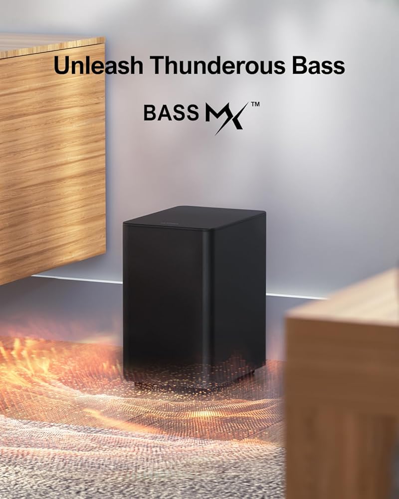 Deep, Room-Filling Bass with Ultimate BASSMX Technology: To deliver a deep and powerful bass, this surround sound system for tv applies BASSMX Technology, enhanced magnetic circuit design, and a larger cabinet to this surround sound system for tv. Volume of subwoofer can be adjusted to 3 levels by pressing bass button on the remote.