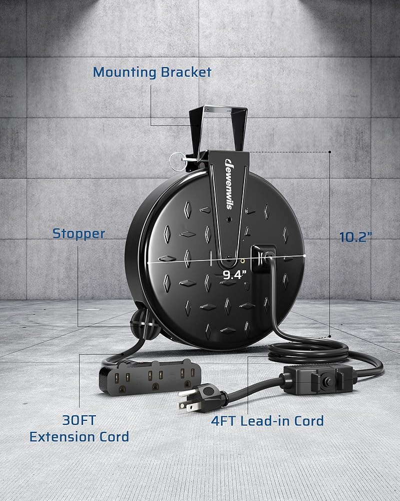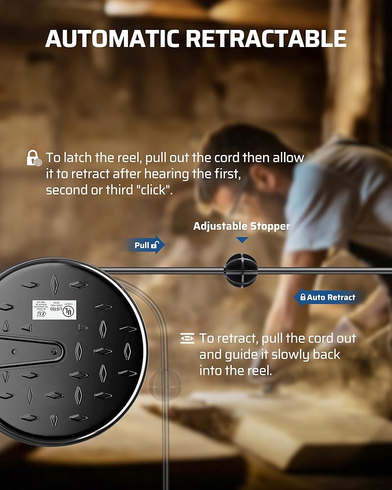 【 Automatic Retractable 】 The power cord reel retracts quickly and smoothly with a clever auto-guide rewind mechanism to avoid kinks and tangles; the ratcheting system will lock the cord at any length and allow you to quickly store it when finished