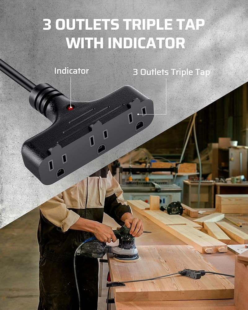 【 3 Grounded Outlets Triple Tap with Indicator Light 】 The grounded triple tap pigtail allow you to power multiple appliances simultaneously and maximize the usage of power strips and wall outlets; indicator lights up when the cord is powered to let you know the electrical cord reel is ready to use