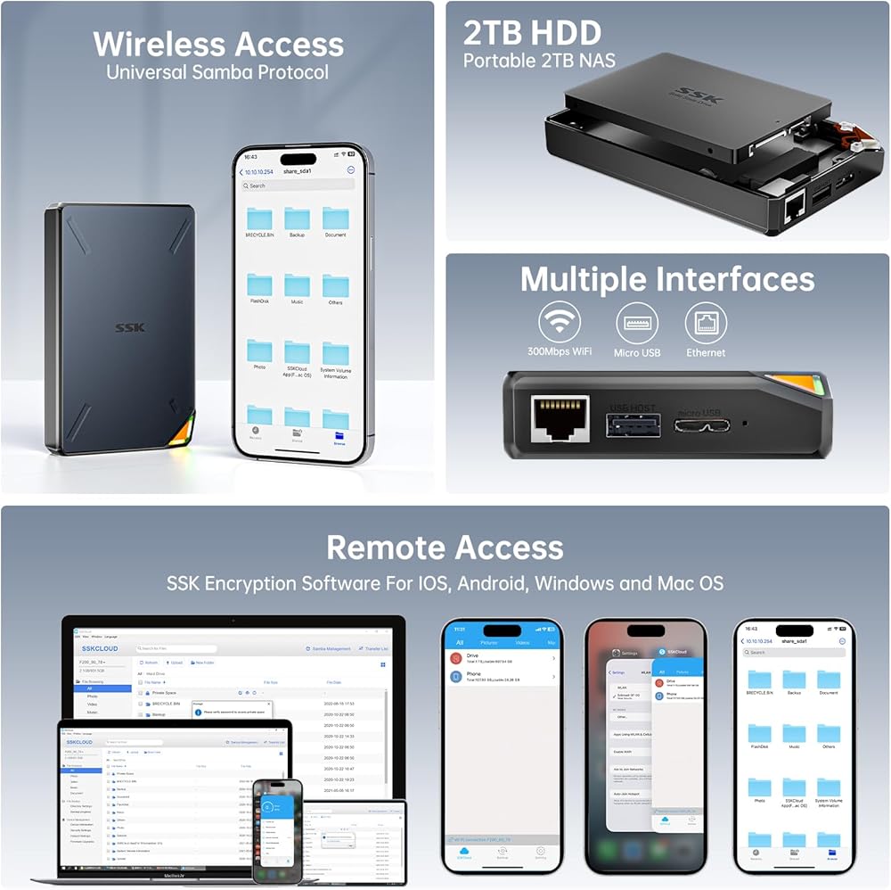 Smart Control: Smart App(IOS & Android supported), smart upload/download, one Click backup, remote access easier. Supports multi-people sharing at the same time; Supports Samba and DLNA Protocol, all smart devices interconnection in the LAN, smart TVs, laptops and mobile phones can share SSKCloud data; Divide hard drive to Private Area and Public Area to better retain private information and improve security; One Click backup On Mobile Phones, Tablets and PCs