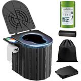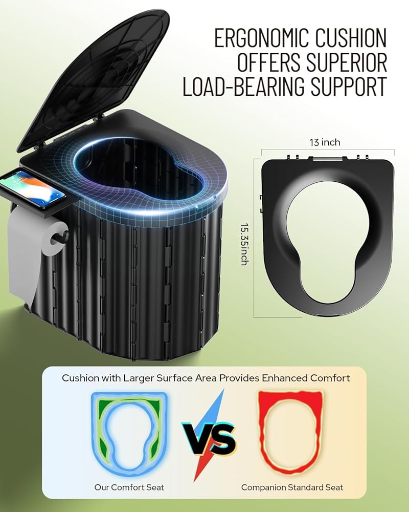 ERGONOMIC CAMPING TOILET- Taller, larger, and foldable for portability. Designed with a seat cushion specifically for the American body, offering a larger contact area for enhanced comfort. Includes trash bags and liquid solidifier to effectively deodorize and clean urine and feces.